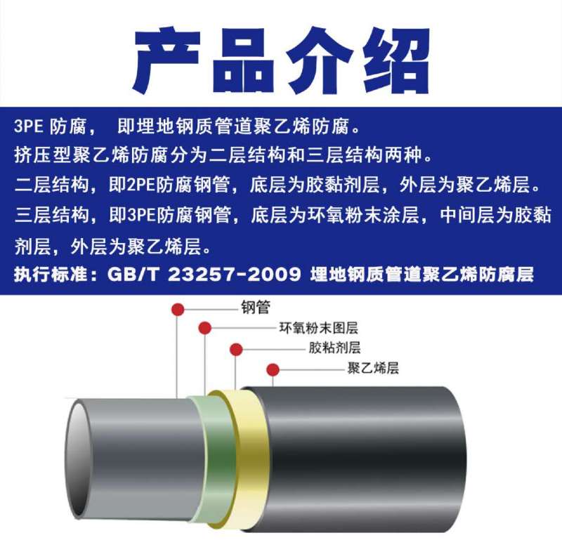 我公司是河北一家專業(yè)的3PE防腐鋼管廠家,埋地輸水用3PE防腐鋼管,供水用3PE加強(qiáng)級防腐鋼管,燃?xì)廨斔陀?PE防腐鋼管,熱網(wǎng)供熱用3PE防腐鋼管,3PE加強(qiáng)級防腐鋼管,我公司以優(yōu)質(zhì)的無縫鋼管,直縫鋼管,螺旋鋼管作為基材,加工3PE防腐無縫鋼管,3PE防腐直縫鋼管,3PE防腐螺旋鋼管.3PE防腐:管道三層PE防腐結(jié)構(gòu):第一層環(huán)氧粉末(FBE>100um),第二層膠粘劑(AD)170~250um,第三層聚乙烯(PE)2.5~3.7mm。三種材料融為一體,并與鋼管牢固結(jié)合形成優(yōu)良的防腐層。2PE防腐:管道二層PE防腐結(jié)構(gòu),第一層膠粘劑(AD),第二層聚乙烯(PE),二種材料融為一體,各層厚度同三層PE相同.3PE防腐鋼管 (三層聚乙烯)工藝是上世紀(jì)90年代后期從國外引進(jìn)的先進(jìn)防腐技術(shù),它的全稱為熔結(jié)環(huán)氧/擠塑聚乙烯結(jié)構(gòu)防護(hù)層。3PE防腐技術(shù)綜合了環(huán)氧涂層與擠壓聚乙烯兩種防腐層的優(yōu)良性能,將環(huán)氧涂層的界面特性和耐化學(xué)特性與擠壓聚烯防腐層的機(jī)械保護(hù)特性等優(yōu)點(diǎn)結(jié)合起來,從而顯著改善了各自的性能。其特點(diǎn):機(jī)械強(qiáng)度高、耐磨損、耐腐蝕、耐熱、耐冷、可應(yīng)用于150度介質(zhì)中,在寒冷地帶均適應(yīng)。因此,3PE防腐層是理想的埋地管線外防護(hù)層。據(jù)權(quán)威部門檢測,用3PE防腐技術(shù)的埋地管道壽命可長達(dá)50年。