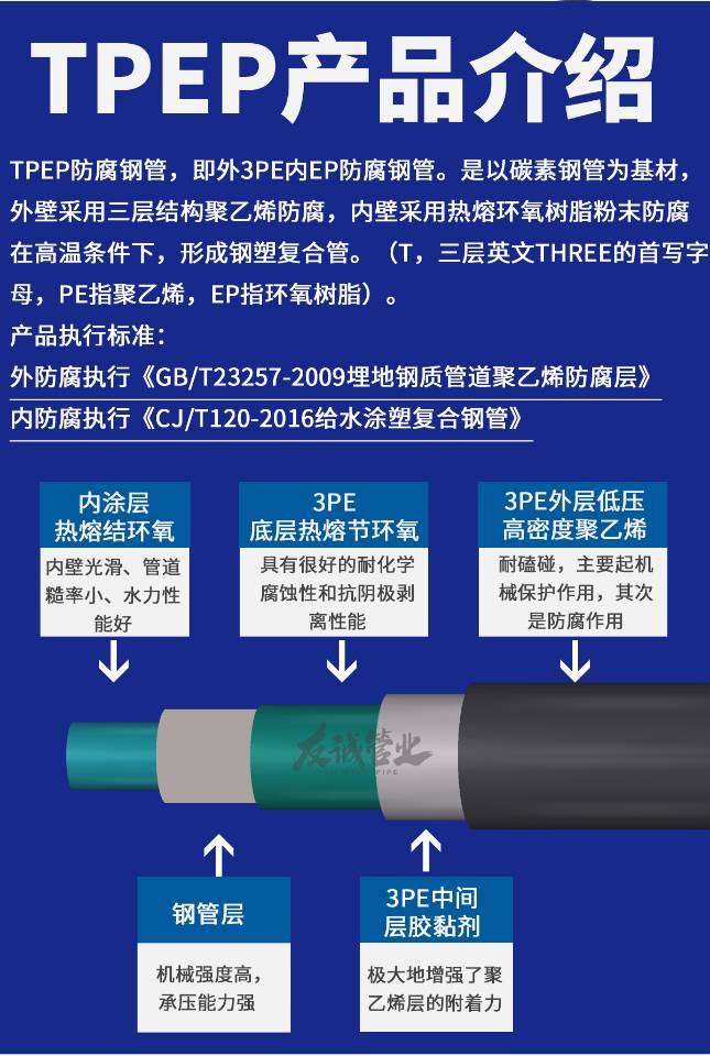 TPEP防腐鋼管全稱(chēng)為:外纏繞聚乙烯內(nèi)熔結(jié)環(huán)氧防腐管道。TPEP防腐管道(T是Triple,表示三倍的,三部分的,這里指三層的,PE,聚乙烯,EP,熱熔結(jié)環(huán)氧樹(shù)脂粉末) 二、母材鋼管材質(zhì): 無(wú)縫、直縫或者螺旋鋼管,三、外壁防腐形式: 采用三層結(jié)構(gòu)聚乙烯防腐涂層,厚度≥2.5mm;執(zhí)行標(biāo)準(zhǔn):《埋地鋼質(zhì)管道聚乙烯防腐層》 四、內(nèi)壁防腐形式: 采用熱熔結(jié)環(huán)氧樹(shù)脂粉末涂層,厚度≥350um,執(zhí)行標(biāo)準(zhǔn):《給水涂塑復(fù)合鋼管》 五、生產(chǎn)工藝介紹: TPEP防腐管道,產(chǎn)品內(nèi)壁采用中頻加熱噴涂環(huán)氧樹(shù)脂粉末的防腐方式,粉末經(jīng)高溫加熱熔結(jié)后均勻地涂覆在管體表面上。產(chǎn)品適用于多種條件下的管道輸送工程,是對(duì)傳統(tǒng)管道產(chǎn)品的一次革命,是替代鋼筒砼管、球墨鑄鐵管、PE管等傳統(tǒng)產(chǎn)品的選擇。TPEP是一種防腐結(jié)構(gòu),是新一代應(yīng)用于長(zhǎng)距離輸水管道的防腐形式,與傳統(tǒng)輸送管道對(duì)比,具有諸多優(yōu)勢(shì)特點(diǎn),管道外防腐為3PE,管道內(nèi)防腐為熔結(jié)環(huán)氧粉末,管道內(nèi)壁的防腐標(biāo)準(zhǔn)達(dá)到了食品級(jí)